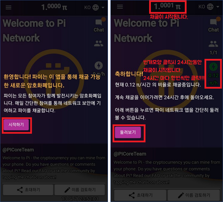 파이네트워크에서 파이코인 채굴방식으로 모바일 어플에서 24시간 마다 채굴할 수 있는 간단한 조작과
