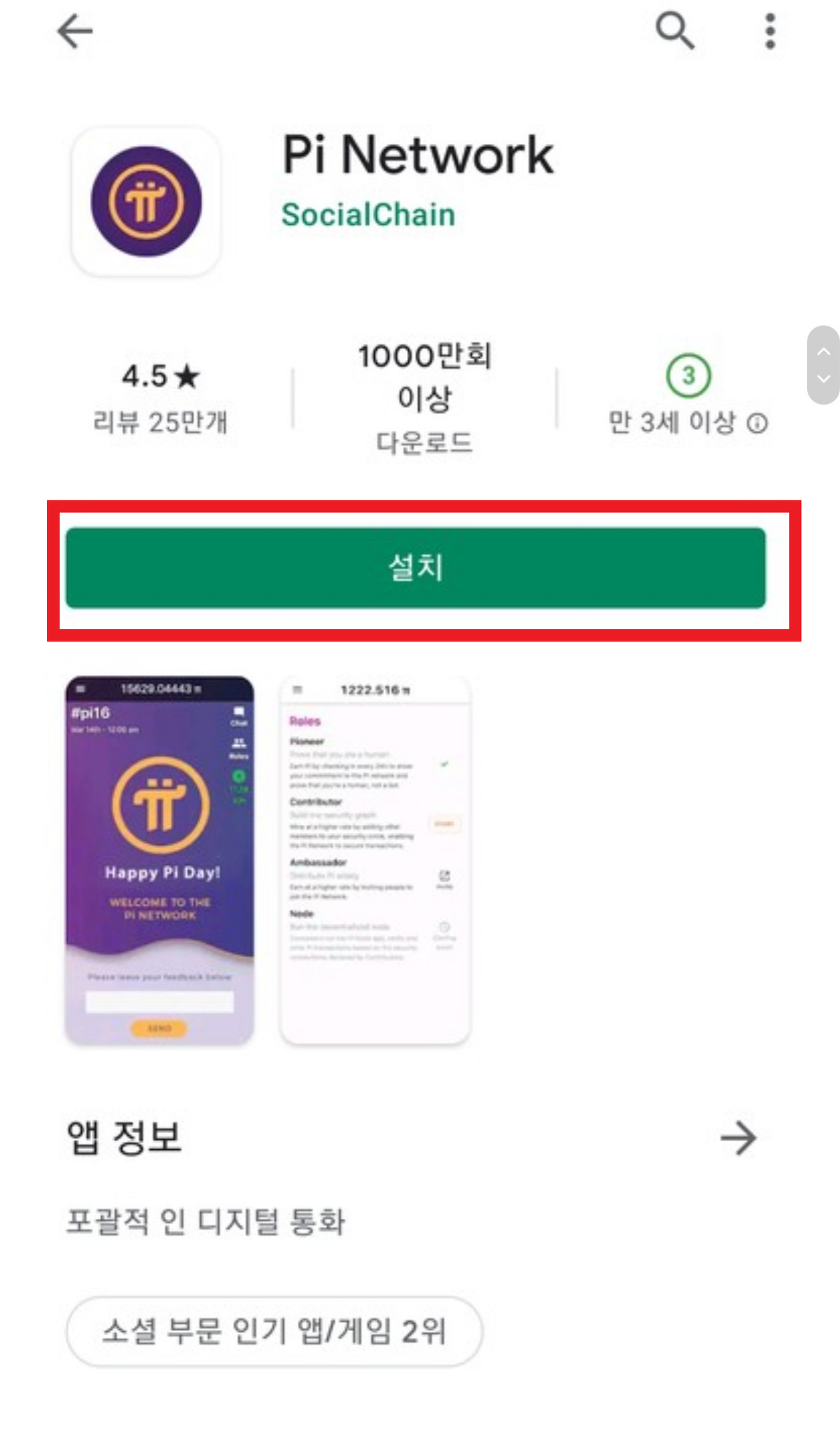 - 채굴을 위한 어플을 설치해줍니다. 구글 플레이스토어에 Pi Network를 설치해주세요.